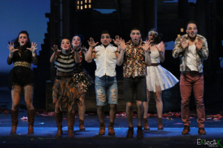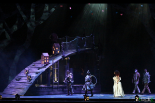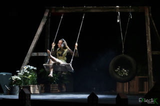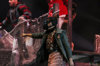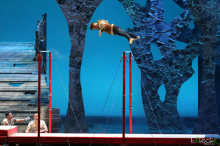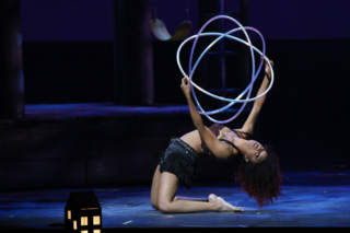 Rangée E, siège 7, à l’approche de 21h : c’était un rendez-vous entre les acrobates — Et quels acrobates! — et moi. Des décors, plus simples et minimalistes que ceux auxquels la production nous a jadis habitués, mais néanmoins très beaux, ornaient la scène : une plateforme de bois telle un vieux quai en demi arche centralisait le tableau et était encadrée de grands arbres de papier mâché ; de petites et coquettes maisonnettes parsemaient le reste de l’espace. La salle cacophonique bouillonnait d’excitation et la soirée s’annonçait très divertissante : des acteurs passaient déjà entre les rangées afin d’animer les nombreux spectateurs avec leurs mises en scène. Un pseudo réparateur de sièges exubérant taquina d’ailleurs l’une de mes voisines de siège en lui demandant, au bout d’environ 7 minutes de folies, de le téléphoner si elle avait quelque problème de vis et de boulons que ce soit. Une intervention qui en fit rigoler plusieurs!
