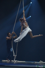 Un doux début, entremêlant magie et mélancolie, nous introduisit Margot, une jeune fille s’envolant au-dessus de la banlieue pour imaginer la vie des gens qui habitent les jolies maisons illuminées d’une chaleur à rendre jaloux. Coup de théâtre, c’est la pièce Les hirondelles qui se chargea de nous transporter dans l’univers de la protagoniste au rythme impressionnant du trapèze ballant. Un choix magnifiquement inattendu, mais allant de pair avec les rêveries du personnage principal. La représentation continua de voguer entre les acrobaties, plus grandioses les unes que les autres, décrochant des exclamations de stupéfaction au public et les chansons de la formation qui font maintenant vibrer la francophonie depuis plus de deux décennies. Ce qui surprend agréablement, surtout, c’est le choix de celles-ci, que nous aurions pu attendre plus prévisibles, mais il n’en fut rien et c’est tant MIEUX, car le spectacle permettait davantage de découvertes pour l’assistance moins aguerrie et un effet d’émerveillement rehaussé pour les fans de longue date. Cependant, pour tout dire, la trame narrative s’essouffla plus vite que les athlètes en se perdant peu à peu dans ce tourbillon de pirouettes. Cela ne dérangea toutefois pas le public, obnubilé par le talent qui se produisait sur les planches et avec raison, car nous étions de plus en plus estomaqués au rythme de la progression.