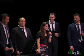 Alternant entre moments divertissants et instants touchants,les hommes de Quartom ont aussi prouvé qu’ils sont capables de chanter en compagnie d’autres artistes et d’avoir une belle chimie. Grande admiratrice de Barbara et habituée d’explorer son univers, Marie-Thérèse Fortin a rejoint »ses quatre garçons » pour Dis, quand reviendras-tu?. La polyvalente femme a bouleversé par la fragilité et la sincérité qui émanaient de son élégant spectre vocal. À l’aise, quant à elle, dans le monde d’Édith Piaf, Marie-Élaine Thibert a offert Mon Dieu avec une puissance sidérante qui accotait celle de la formation. Il s’agissait d’une belle attention puisque, la semaine dernière, Quartom avait interprété cette même pièce au même théâtre dans le cadre du spectacle que Marie-Élaine présentait pour souligner ses quinze ans de carrière. Deux auteurs-compositeurs-interprètes étaient également de la fête : Yann Perreau pour la splendide ballade Conduis-moi et Catherine Major pour la déchirante et poétique Amadeus tirée de son troisième album Le désert des solitudes.